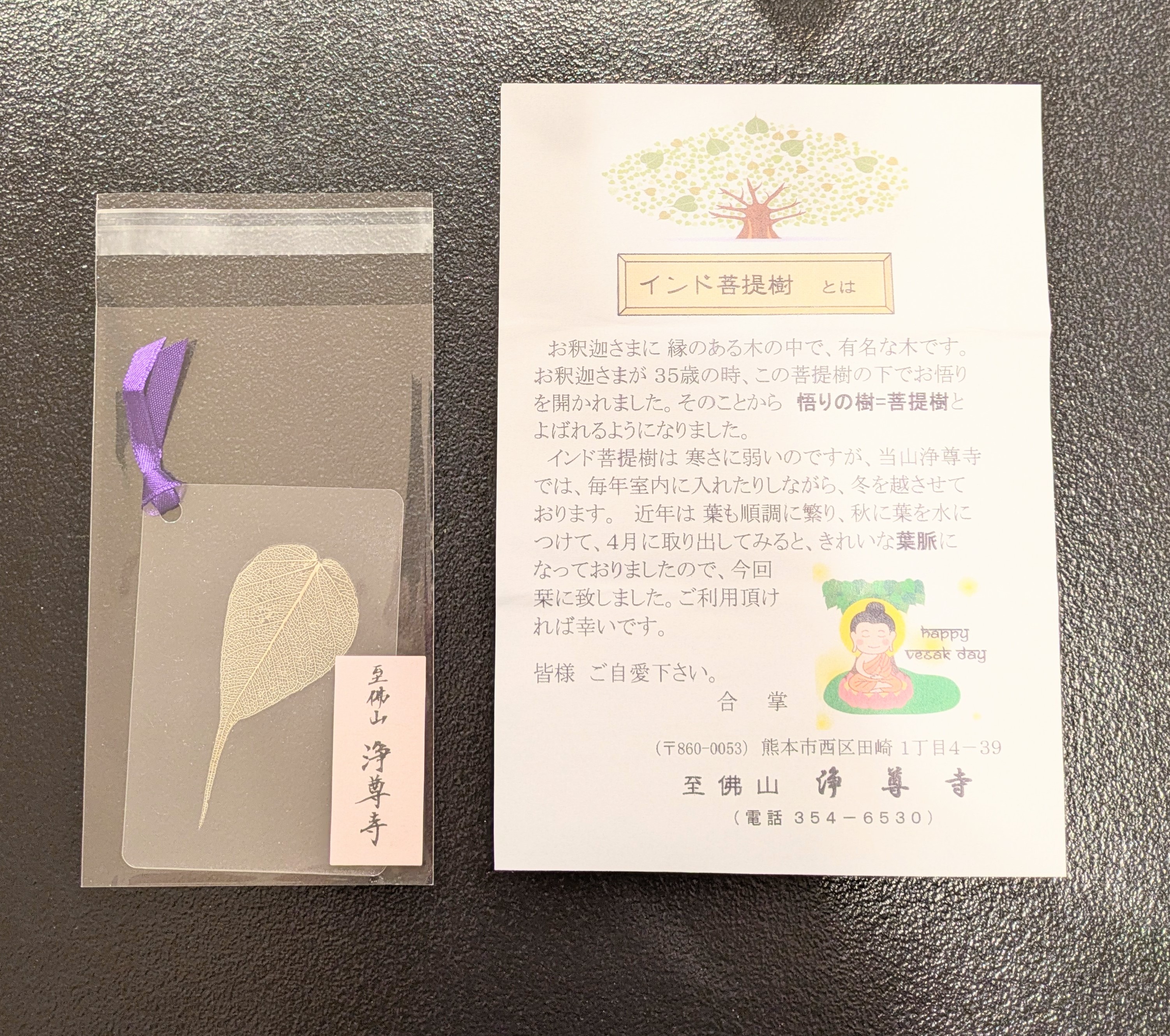 ご参拝いただいた皆様にお菓子と、当寺で育てたインド菩提樹の葉脈でしおりを作成して持って帰っていただきました。